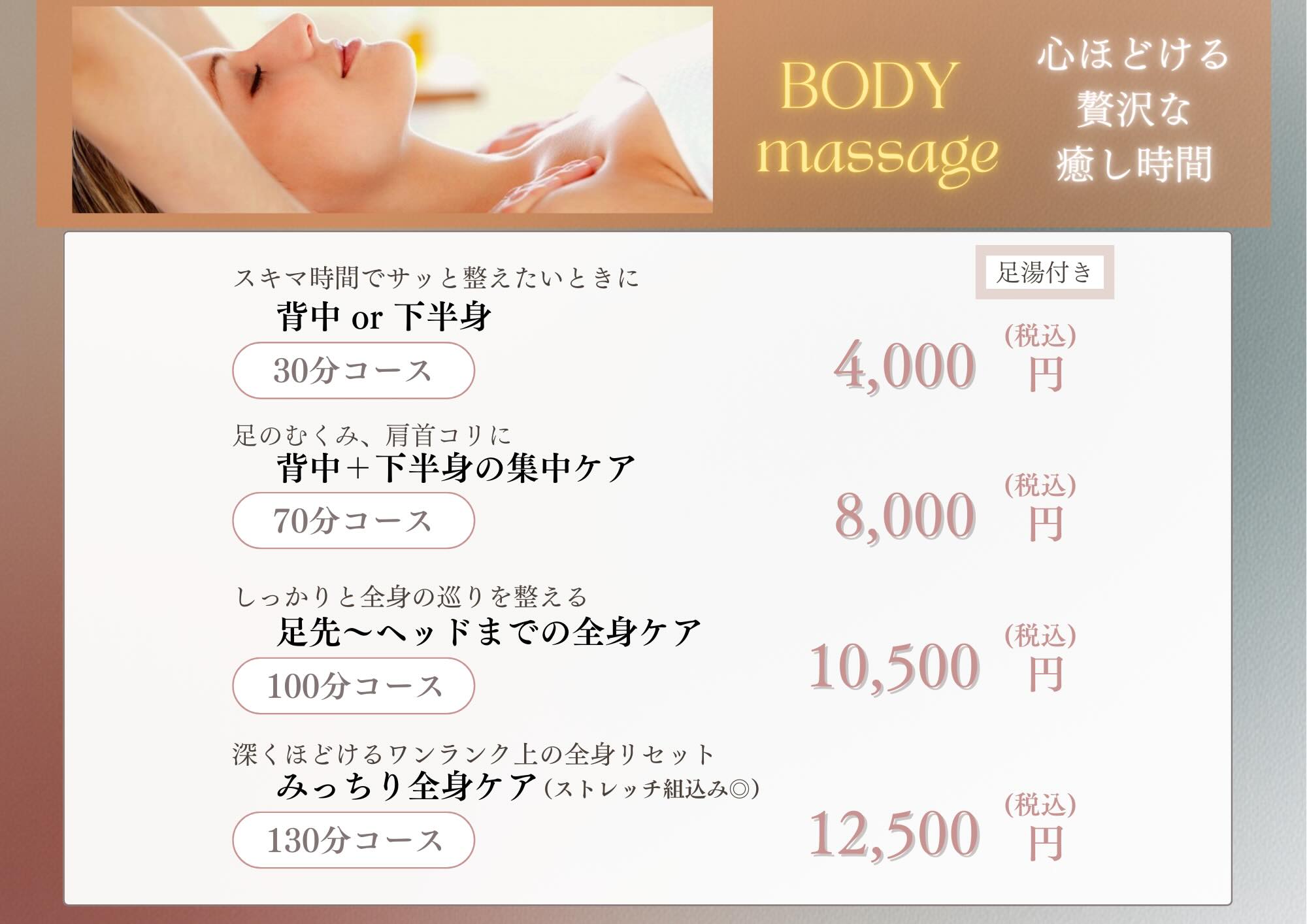 『一人ひとりに合わせたオーダーメイド施術』で 心と身体を緩める”あなただけの癒し時間”をお届けします。